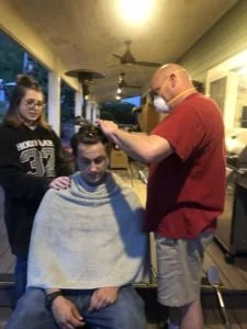 And Jacob? Like Bill’s done for his brother, he’s given Jake his haircuts too, though our second-born’s desired styles have, many times, been beyond what Bill felt comfortable doing and, thus required a skilled barber. (Bill does know his limits, after all.)Most recently, Jake sat on a stool on our porch–fireflies and tree frogs offering entertainment–while Bill, wearing a mask, cut his son’s hair in a new style. “Can you do it?” Jacob inquired. “Don’t take too much off the top.” His girlfriend Chloe stood nearby, offering moral support, and his dad said several times–