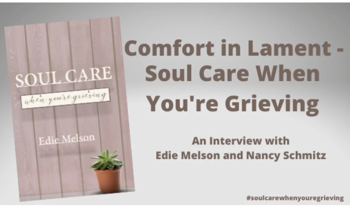 Author Edie Melson knows a thing or two about grief, having experienced significant loss in her lifetime–the loss of her father to Alzheimer’s; the loss of a friend to suicide and another who was murdered; the recent loss of her daughter-in-law who passed away from injuries sustained in a farming accident.I first met Edie at a Christian writers conference at The Cove some years ago. More recently I was introduced to her Soul Care series when my name was randomly chosen in a drawing at Blue Ridge Christian Writers Conference, of which Edie is co-director. My gift? Another book of hers, Soul Care for Writers.Edie has written her third in the series, released just yesterday, from personal experience. Soul Care When You’re Grieving is her heart poured out on the page. She wrote it for each of us who grieve, for people like my dear friend Nancy.I’ve known Nancy Schmitz for over a quarter of a century, having attended the same church while we lived in Greenville, SC. She babysat our sons when they were littles, and I was her oldest daughter’s 5th grade teacher. Despite the miles that have separated us for more than two decades now, we’ve stayed close, picking up right where we left off–a sign of true friendship.Nancy, too, knows a thing or two about grief. She lost her husband Alan a little over three years ago on March 14, 2019 and son Jon Kyle just a year ago on September 24, 2020. Their absence aches every day, and despite the blessings that remain in her two daughters, her sons-in-law, and grandchildren, the vacancies left when these loved ones passed can’t ever be filled.SCWYG is a book written by Edie for someone like Nancy. Packed with personal experience, scripture passages, and prayers, each section ends with activities one might complete to aid in healing. What better way to introduce to the world SCWYG‘s tender words than to share an interview between its author and a reader? Using portions of the weeping prophet’s poetry in Lamentations, I facilitated a dialogue between them.Allow me to introduce to you two beautiful souls, both who grieve. It is my prayer that you will be blessed by them.